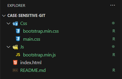 Cara ini adalah cara yang paling mudah untuk mengubah nama file yang banyak sekaligus. Pertama kita perlu me-rename semua folder atau file. Disini kita coba rename folder css dan js menjadi kapital di huruf depannya saja.